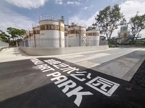 公园划分为艺术公园、运河活力区和油罐探索区三大区域,是拍照打卡的绝佳地点。傍晚时分,夕阳为锈红色的油罐群镀上一层金边,地面“油酷艺术公园”字样在特定角度下呈现出壮观的视觉效果,站在白沙灯塔远望,杨浦滨江的绝美江景尽收眼底。