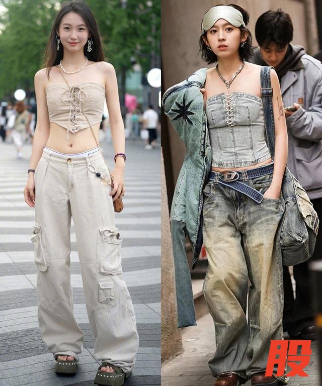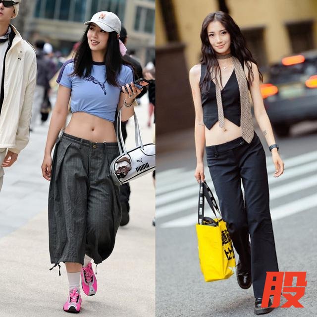 而在女生这边,则以“露腰胯”穿搭为特点。这种穿搭也并非凭空出现,无论在往期的潮流风向中,还是春夏女装趋势中,露脐装、露胯裤早已流行。