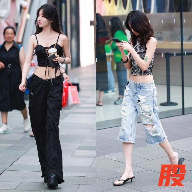 可以借鉴太古里女生的穿法,露腰胯的同时,适当增加脖颈、手臂和腿部露肤,平衡留白面积,更能放大身材优势,整体感觉更显轻盈纤细。