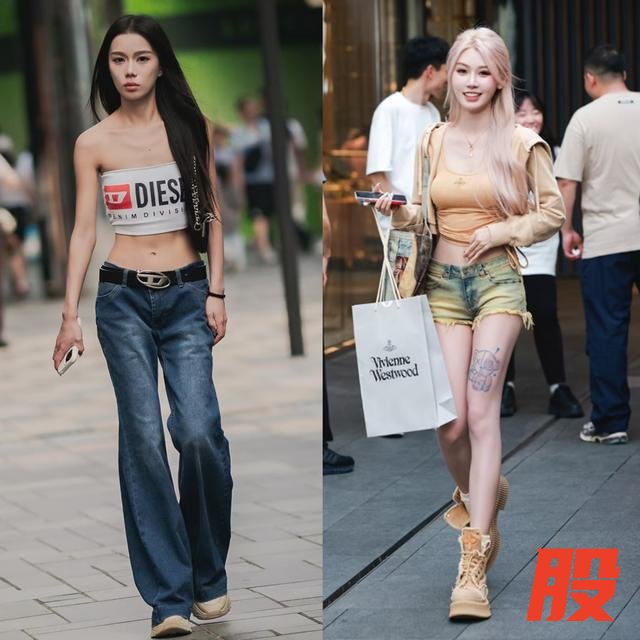 不同于上海街拍的松弛,杭州街拍的高级,成都太古里街拍的特点在于“穿衣自由”——男生穿着低腰裤,大大方方露出内裤边;女生身着露脐装配露胯裤,大胆露出腰胯。